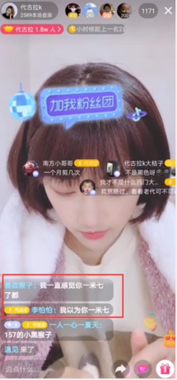 直播当天,有粉丝在弹幕里问到代古拉k 身高,代古拉K在直播中说到,在直播的时候经常会有粉丝问到这个问题,所以她将自己的身高和体重信息都公开在了抖音主页,看到老代157的真实身高,许多粉丝表示不相信,表示平日里看老代的舞蹈直播和照片都给人很高的感觉,自己一直以为老代有一米七,看到粉丝的话,老代打趣地说道,其实都是一些拍照技巧而已了。