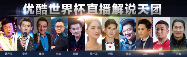 作为2018世界杯央视指定新媒体官方合作伙伴,拿下直播权的优酷同样发力解说团队配置,力求在满足“真球迷”专业需求的同时,兼顾“泛球迷”的娱乐需求。不仅有“五大名嘴+两大前国脚”的央视金牌解说员组合,优酷更组建了一支“央视专业解说+文体明星+二次元声优+粤语解说”的多元特色“解说天团”,在专业性的基础上显现出更多娱乐多元的互联网特色。